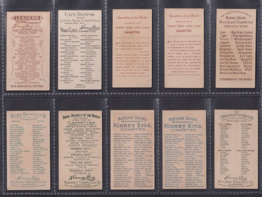 Cigarette cards, USA, Kinney, ten type cards, Animals (1), Butterflies of the World (x2, one light background, one gold background), Famous Gems of the World (1), Leaders (1), Harlequin Cards (1), National Dances (x2, one with white border, one without), Naval Vessels of the World (1) & Surf Beauties (1) (gd) (10)