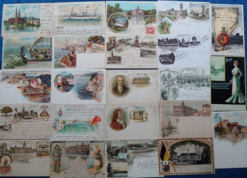 Postcards, a selection of approx. 68 Gruss Aus and Gruss Aus style cards inc. 17 cards illustrated by Wielandt (all Italy). Also mostly German Gruss Aus posted 1895-1900 from Hanover, Pillnitz, Kaiser Wilhelm 1797-1897, militaire, Dortmund, Potsdam, Hamburg, Koln, Dresden etc. Sold with a few Swiss, Paris, Moscow, Cairo, shipping, Portugal and 4 HTL (meteor (3), cutout (1)). Nice mix (mixed condition)
