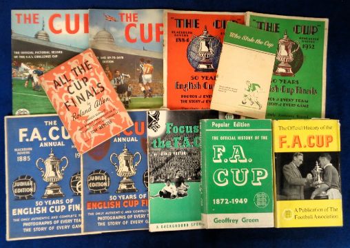 The FA Cup. A collection of 11 books & booklets, 'Who Stole the Cup?' published by Shillcock's, 'All the Cup Finals' by Roland Allen 1947, 'The Cup' Official Pictorial Record of the FA Challenge Cup (2 different versions), 'The Cup 50 Years of English Cup Finals', four different versions '1883-1932' (Green cover), '1884-1933' (Orange cover), '1885-1934' (Blue Cover) and 'Jubilee Edition' 1934, also 'Focus on the FA Cup' by Denis Foster. Sold with two hard backed books, both with dust jackets, 'The Official History of the FA Cup' and 'The Official History of the FA Cup, 1872-1949' both by Geoffrey Green & published in 1949. (gd). From the Phil Martin Collection.