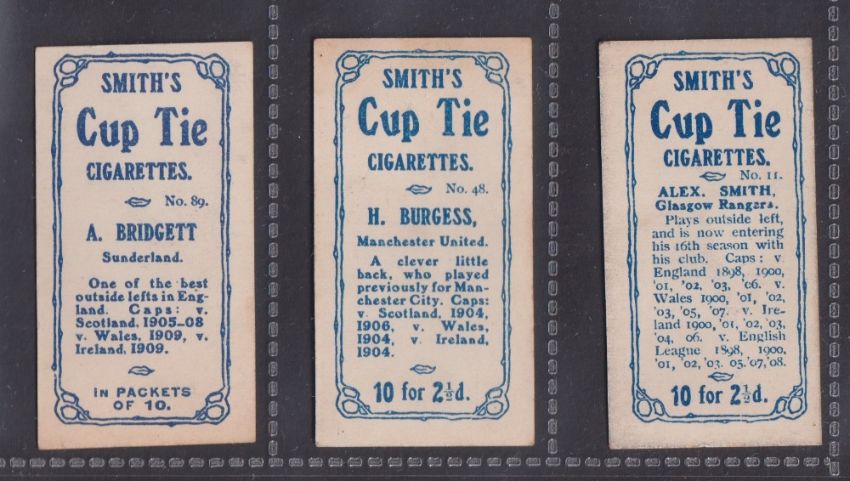 Cigarette card, F & J Smith Footballers 1909 Cup Tie Back, 3 cards nos. 11 (Smith, Rangers), 48 (Burgess Manchester United), 89 (Bridgett Sunderland) (gd)