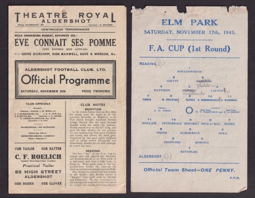 Football programmes, Aldershot v Reading, FA Cup 1945/46, home & away issues, 1st Leg played at Reading 17 Nov 1945, single sheet (some paper loss to top edge, pencil score & tc noted) & 2nd Leg at Aldershot on 24 November (4 page issue, gd) (2)