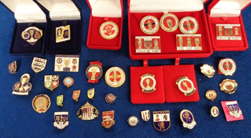 Football badges, a selection of 35+ enamel badges inc. Chelsea, Manchester Utd, Arsenal, Tottenham, Aston Villa, Leeds etc some in special issue cases/boxes, mostly 1990's onwards (vg)