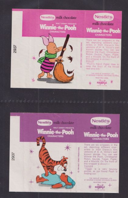 Trade Chocolate Wrappers, 26 Chocolate Wrappers in 4 sets of 6 and 2 individual items. Sets are Cadbury's (2) The Shoe People & Wildlife Bar, Nestle (2), Winnie the Pooh & Robin Hood plus 2 wrappers Cadbury's Strawberry Tray & Caramello brands (gen gd)