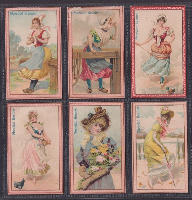 Trade cards, France, Chocolat Besnier, 20 early cards including Beauties M sized (14), 4 XXL shaped embossed cards with just firm's name on back (2 with light ink staining on backs), 2 fancy framed G sized cards, Children at play (fair/gd some with marks on backs)