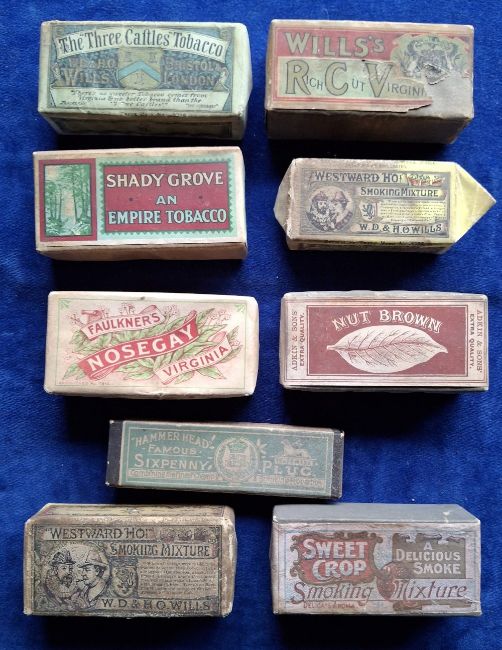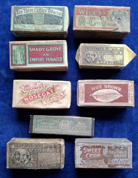 Tobacco Packets, Small quantity various items including 8 empty Tobacco Packages including Adkin Nut Brown, Faulkner's Nosegay, Cohen Weenen Sweet Crop, Hignett etc, plus 2 similar but smaller size, MC Carathanassis Cigarettes flattened retail box, 4 miniature display items etc (fair/gd)