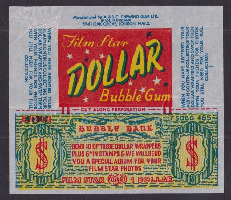 Trade Wax Wrappers, A&BC Gum Film Star Dollar Bubble Gum, 2 Wax Wrappers with original 'Dollar' tokens attached, 1 with A&BC in blue writing, the other in green writing (usual rumpling, gen gd)