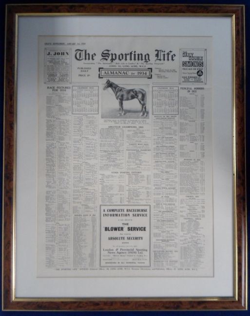 Horse Racing, The Sporting Life Almanac, a collection ten large, rolled, supplements issued with the Sporting Life each one with horseracing fixtures for the year plus various other sporting records & information, 1923, 1924, 1925, 1927, 1928, 1935, 1936, 1937, 1938 & 1939, ideal for framing. The lot does include one additional framed & glazed example for 1934, frame measures 72cm x 55cm. Not Suitable for posting, BUYER MUST ARRANGE COLLECTION.