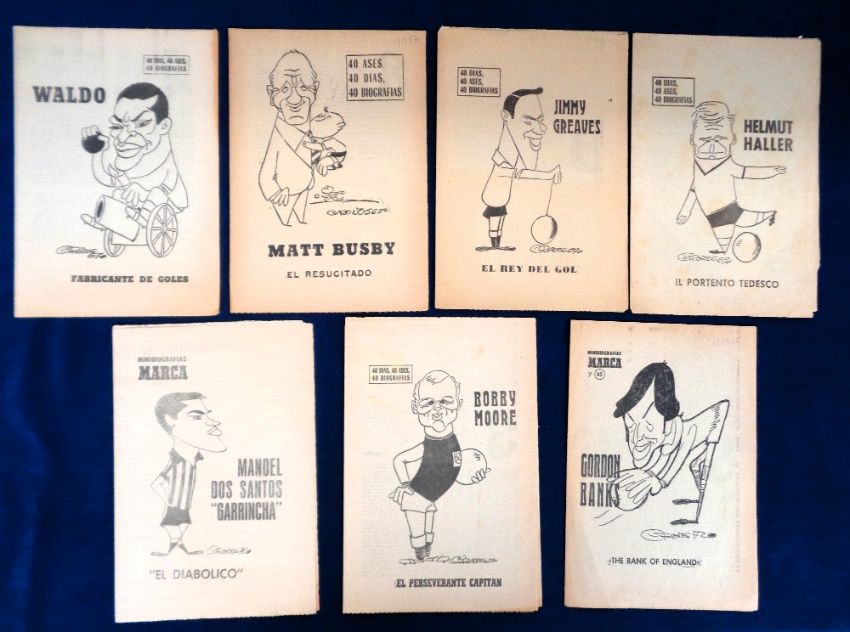 Football, a collection of seven Spanish issue paper biographies 1960/70's featuring Matt Busby, Jimmy Greaves, Helmut Haller, Bobby Moore, Garrincha, Gordon Banks & Waldo (gd). From the Phil Martin Collection.