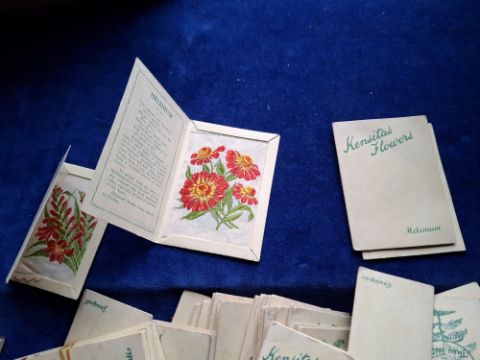 Cigarette card silks, J Wix Kensitas Flowers over 130 "L" sized silks folders and silks not checked for sets, duplication. Mixture of printed and plain back folders (some folders with numbers written in ink, most are not numbered. Sold with approx. 50 smaller sized examples in lower grade condition, together with a few loose silks and empty folders (L sized silks not written on are gen gd)