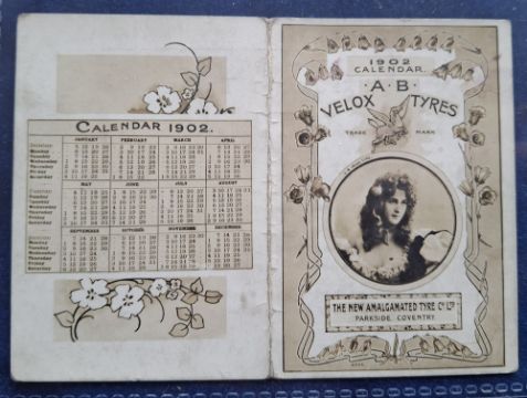 Trade card advertising issue, New Amalgamated Tyre Co, Coventry Foldout 1902 Calendar with Beauty on the front cover (card is XL size when opened out) (fair)