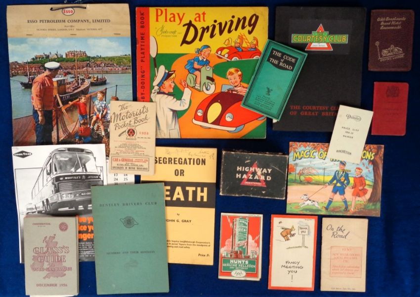 Motoring, approx. 100 items to include the Double E game Highway Hazard, 1930 'On the Road' regulations booklet, 1928 The Motorists Pocket Book, Bentley Drivers Club booklets, ROSPA booklet 'Fancy Meeting You!' illustrated by Fougasse, advertising materials, ROSPA magic painting book circa 1960, 1946 The Courtesy Club booklet, 1950s Glass's Guides, 'The War Time A1 Atlas to London', 1948 Earls Court 33rd Motor Exhibition catalogue, a box of Fairy Surveys Ltd 1966 London aerial b/w photos of Greater London (approx. size 9.25 x 9.25") and much more (gen gd)