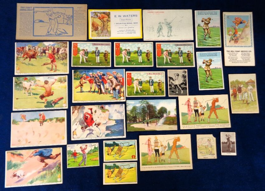 Trade cards, Golf, a selection of approx. 25 UK & Continental golf related cards, several postcards including North British Rubber Co Golf Rules postcards (6), Morayshire Game Farm postcard with Golfing Caricature image, E.W. Waters golfing image blotter, various continental cards (14), a part complete Bell Pump Service Co, USA Diary for 1967 etc (gen. gd)
