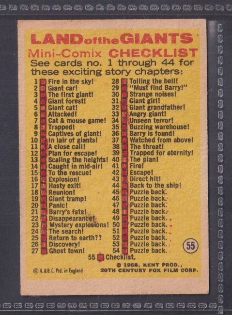 Trade cards, A&BC Gum, Land of the Giants (set 55 cards) (checklist marked, otherwise gd)