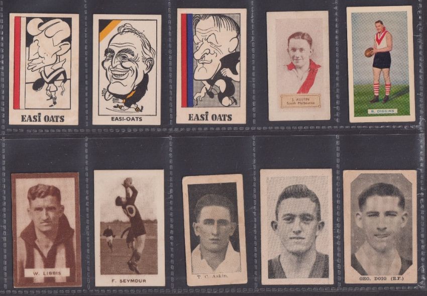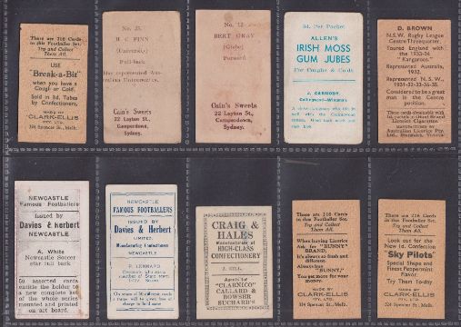 Trade cards, Australia, a collection of 20 type cards all featuring Australian Rules Football or Rugby League players, various issuers & series inc. Australian Licorice Co, Allen's, Cain's Sweets, Clark-Ellis, Craig & Hales, Davies & Herbert, Easi-Oats, Hoadley's, MacRobertson's, Morrows & Plaistowe Toffee (some with minor faults, mostly gd) (20)