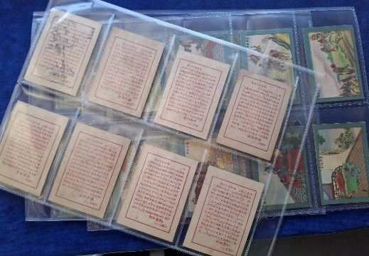 Cigarette cards, China, Over 320 cards in 7 part sets, all M Sized, Chinese Warriors (85, plain back, paper labels), Chinese Plays (87, Red Factory printed backs), Chinese Couples (33, red printed back), Chinese Warriors red border (32, red printed backs), Chinese Warriors blue borders (22, red printed backs), Pureness (21, blue printed backs), Chinese Actresses / Dancers yellow border (49, blue printed backs) (gen gd a few fair)