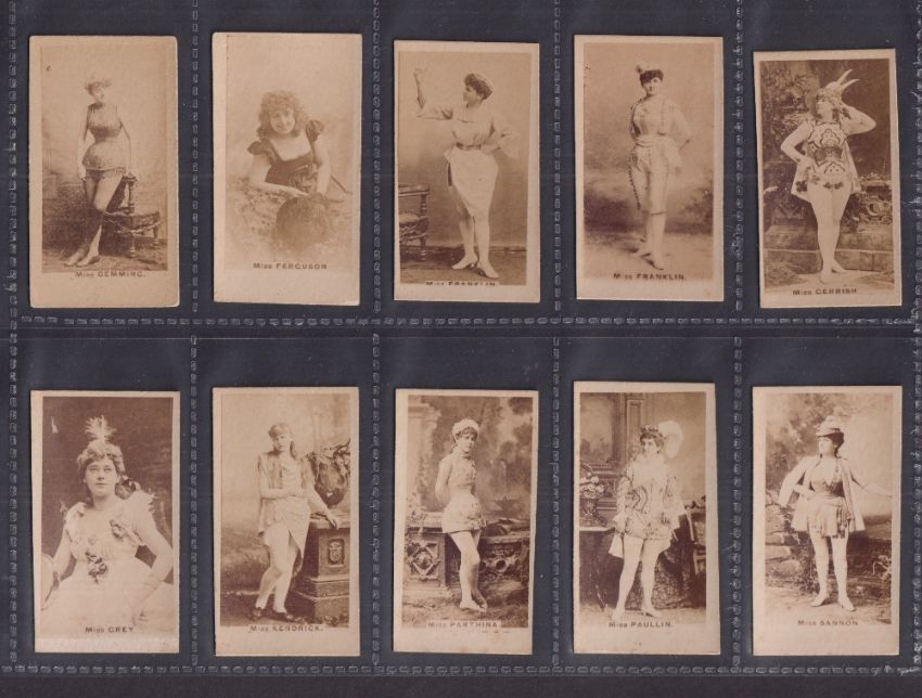 Cigarette cards, Canada, D. Ritchie & Co, Actresses & Beauties, sepia photos, horizontal back 'Smoke D. Ritchie & Co's Cigarettes…', 10 different cards, Miss Demming, Miss Ferguson, Miss Franklin (2 different), Miss Gerrish, Miss Grey, Miss Kendrick, Miss Parthina, Miss Paullin & Miss Sannon (most with scuff to part of back, gen. gd) (10)