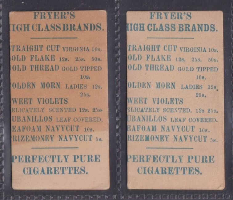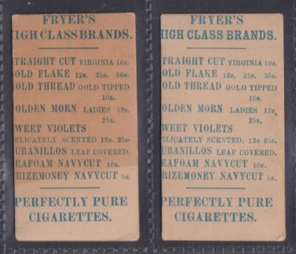 Cigarette cards, C Fryer & Sons, Vita Berlin Series, 2 type cards, Duke of Connaught & Royal Inniskillen Fusiliers. Both cards are very irregularly cut, but measure 68 x 37 mm, which is actually 1mm wider than the dimensions quoted under F912-380 in the World Index Reference book. It is likely these were cut to size to fit into the packets at the time of issue (1 card with toning on back, otherwise fair/gd apart from any trimming that has occurred)