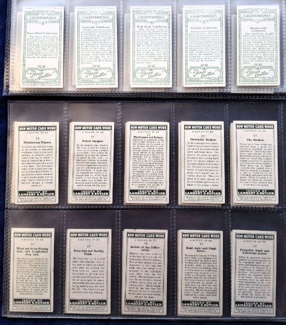 Cigarette cards, 6 sets, Godfrey Phillips Beauties of To Day (series of 50 printed standard sized cards), Hignett Turnpikes, Cope's Worlds Police, L&B (2, Empire Air Routes, How Motor Cars Work), Wills Three Castles Lighthouses (gd)