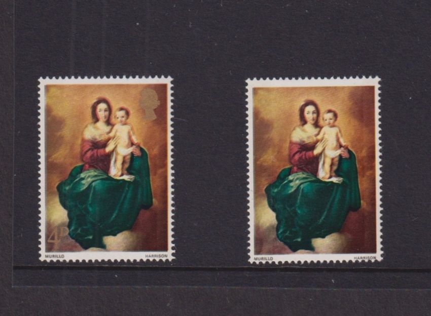 Stamps, GB QEII 1967 Christmas 4d missing gold (value and Queen's head) error, UM, with normal. SG 756a, cat £110