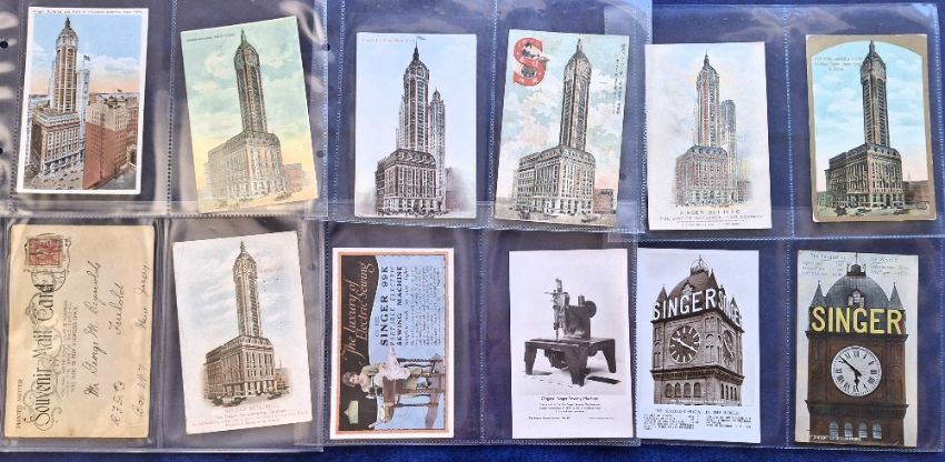 Postcards, Singer Sewing Machines, 27 postcards plus one letter mail card, all Singer related, including 6 colour advertisement cards, the remainder mainly being factory views (mainly Clydebank or New York) (some postally used, fair/gd)