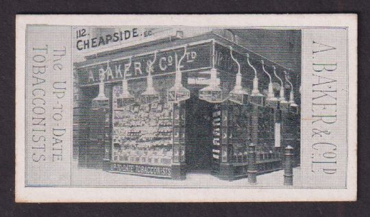 Cigarette card, A. Baker & Co, Baker's Tobacconists Shops (Cigar etc. Manufacturers), type card, 112 Cheapside, E.C. (gd) (1)