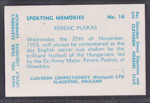 Trade cards, Football, Clevedon Confectionery, Sporting Memories XL sized 96 x 63mm, type card no.16 Ferenc Puskas Hungary (gd/vg)