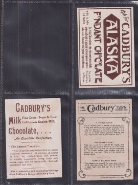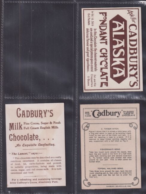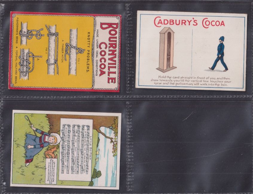 Trade cards, Cadbury's Chocolate, 3 XL sized type cards, Knotty Problems type card, Nursery Rhymes, Little Bo Peep (slight staining on back), Tricks (CAD-390) 'Hold the Card Straight in Front…' (gd unless stated above)