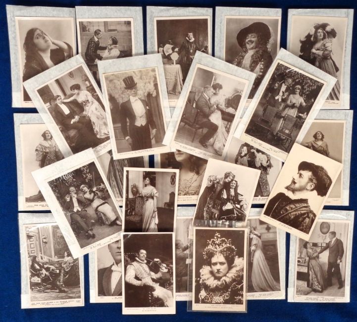 Postcards, Theatre, a collection of 100 postcards of play scenes and actors, mostly Edwardian, from 'The Sins of Society' (7), 'Sir Walter Raleigh' (9), 'Sweet Nell of Old Drury' (11), 'The Thief' (13), 'A Waltz Dream' (27), 'The Whip' (22), 'A White Man' (11). Actors include Lily Elsie, Lewis Waller, Jessie Bateman', Constance Collier, Irene Vanbrugh, Lilian Braithwaite etc. (gd)