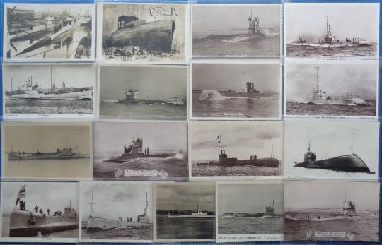 Postcards, Naval, a submarine selection of 17 RPs with illustrated cards of sub no. 12 (photograph) by Lawson Smith (signed) who was also a diver on the ship, subs in Chatham docks (L11 and L25). Also no. 2, E48, Oberon (3 different), Otway, Oxley, Swordfish, E6, A2, C class, L71, 64, L19 (gd)