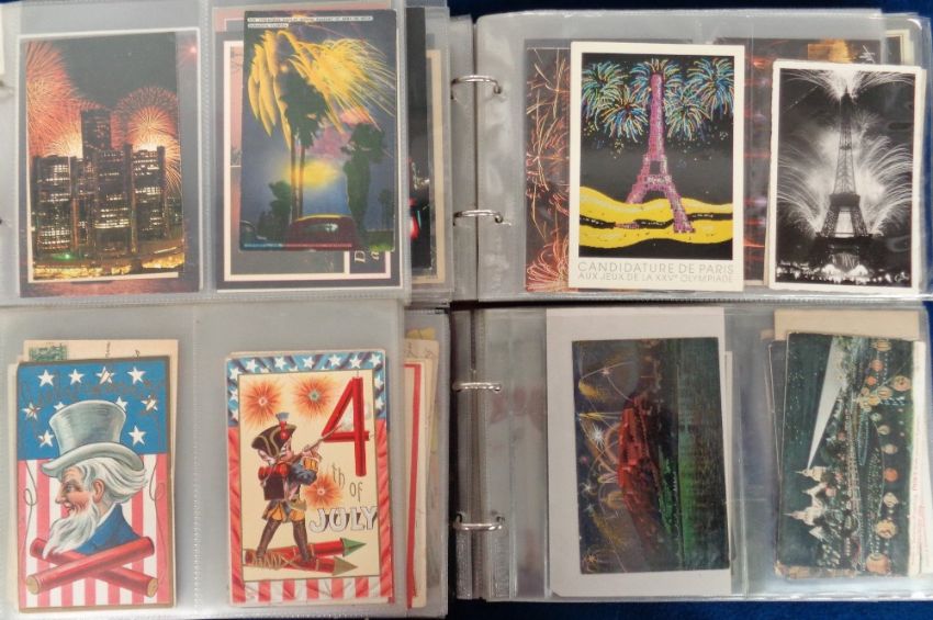 Postcards, Fireworks, an unusual selection of over 600 mixed age cards in 4 albums of firework displays, firework related comic cards and 4th July greetings cards with many embossed chromos (Clapsaddle etc). Good range of comic cards, featuring rockets, sparklers, firecrackers, appliqué, guns, canons, frightened animals, Uncle Sam, children etc. Also Gruss Aus, HTL (cut outs) and RPs of displays, modern cards from Germany, France and Italy. USA cards from early 1900. Nice lot (mainly gd)
