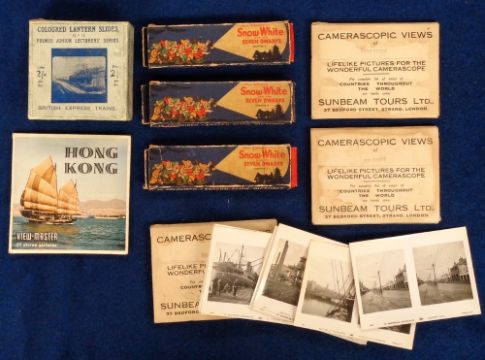 Slides and Views, a selection of glass magic lantern slides to include Primus coloured British Express Trains (no 6 missing but includes 2 others), Walt Disney Snow White (1 missing and replaced with Mickey Mouse and 1 broken), Sunbeam Tours Camerscopic Views of South America, Australia and New Zealand, View-Master pack of Hong Kong (mixed condition fair to vg, all packaging worn)