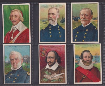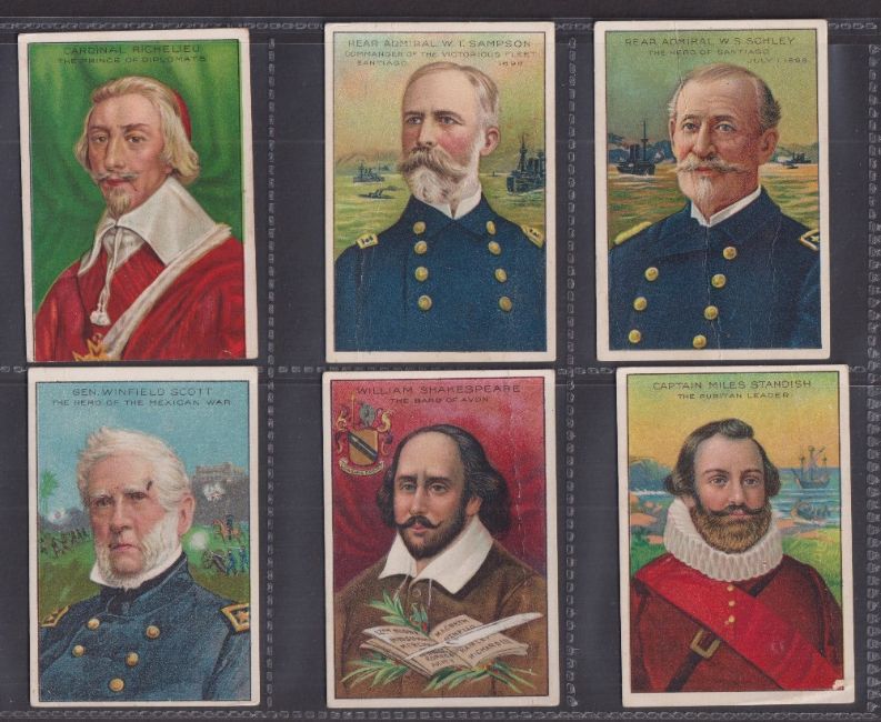 Cigarette cards, USA, ATC, Men of History, 2nd Series (Royal Bengal Little Cigars backs), 'L' size (45/50, missing Hernando Cortez, Elizabeth of England, Robert Emmett, John Harvard & Henry VIII King of England) includes Davy Crockett, Gen. George Custer, President Andrew Jackson, Gen. Stonewall Jackson etc (6 with slight trim, others with some faults, fair/gd)