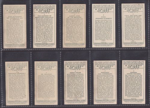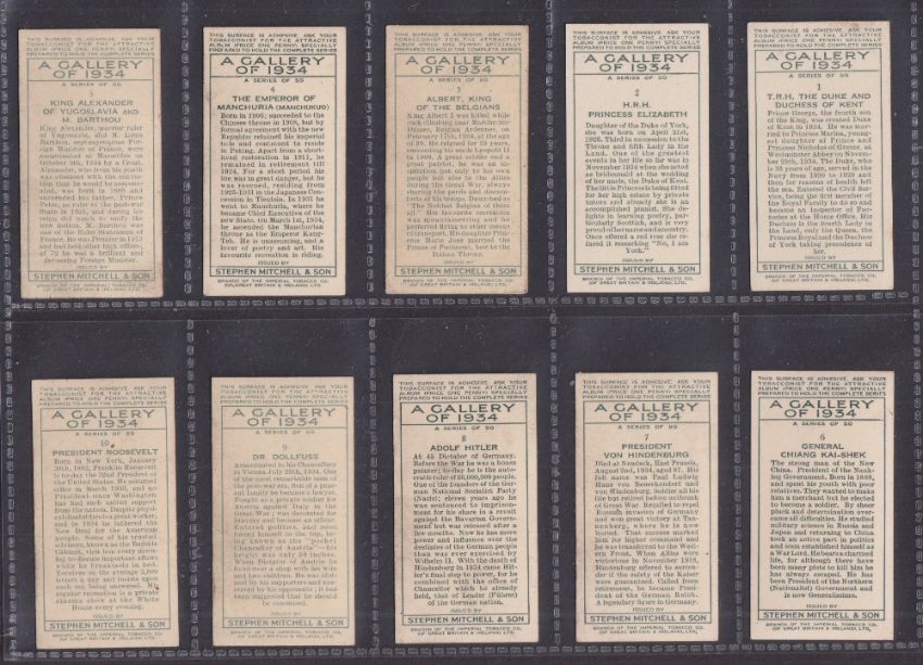 Cigarette cards, Mitchell's, A Gallery of 1934 (set, 50 cards) inc. Don Bradman, Adolph Hitler etc (gd/vg)