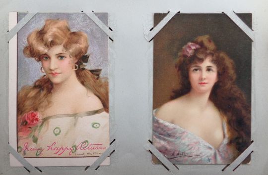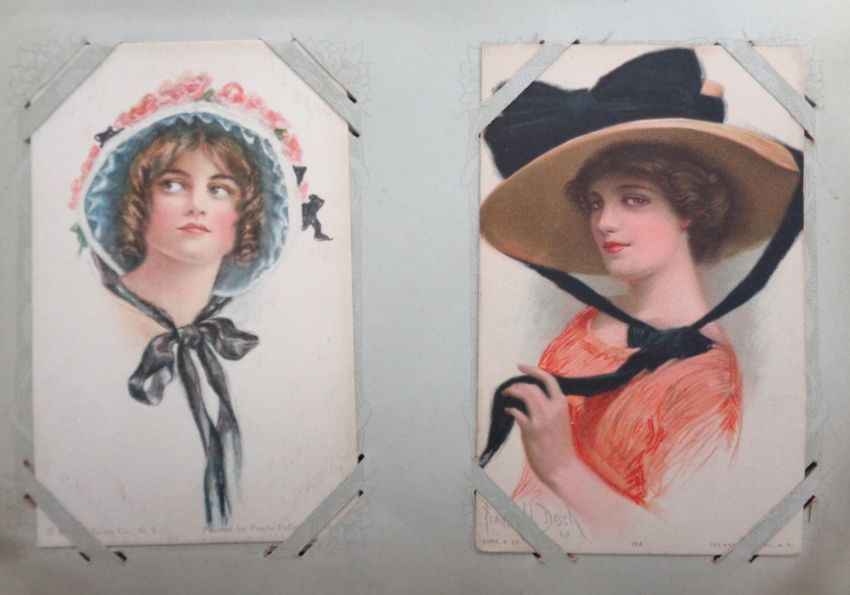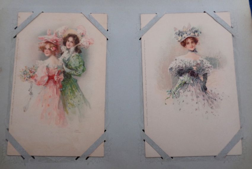 Postcards, Glamour, a collection of approx. 100 glamour cards in vintage album. Artists include Asti, Boileau, Harrison Fisher, Bertiglia, Barber, Sager etc. Themes include pretty girls, risqué, good bathing belles, costume, hats (a few cards a little dusty with some age toning o/w mainly gd)
