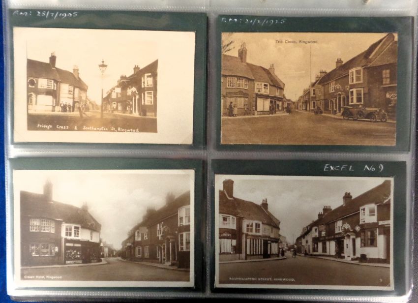 Postcards, Hampshire, a collection of approx. 102 cards of Ringwood in modern album. Cards corner mounted with some annotated, and arranged geographically. RPs and printed cards include High St (approx. 36) mostly all different, many RPs well animated with people, cars, carts etc. Also shop front for Palmers (cloaks), and Pennells The Granary. Other RPs include Friday's Cross, Crown Hotel (several), The Square, Southampton St (several), Christchurch St (many) and showing church, International Stores shop front with staff. Sold with RPs of War Memorial service (4), other views of memorial, Christchurch Rd, and the annual carnival parade 1924, and Candlestick Cottage Café. Nice mix (mainly gd)