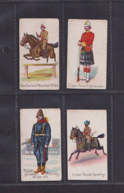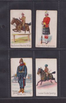 Cigarette cards, Harvey & Davy, Colonial Troops, four cards, Cape Town Highlander, Indian Cavalry Guide, New Zealand Mounted Rifles & Royal Canadian Artillery Winter Kit (all with slight faults, fair/gd) (4)