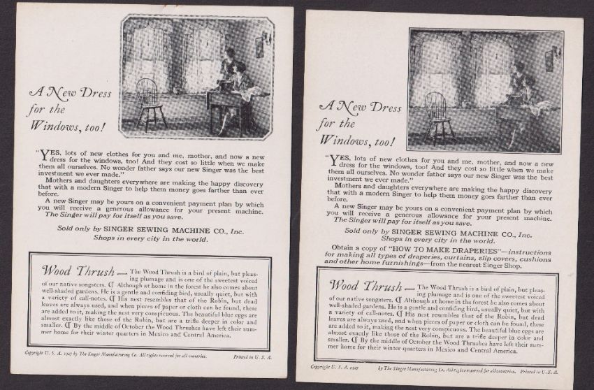 Trade cards, Singer Sewing Machines, Birds, American Song Birds, 21 cards (larger than 'P' size), 16 different designs and 5 variations (date or format on bottom line of text on rear of card) (gen gd a few fair)