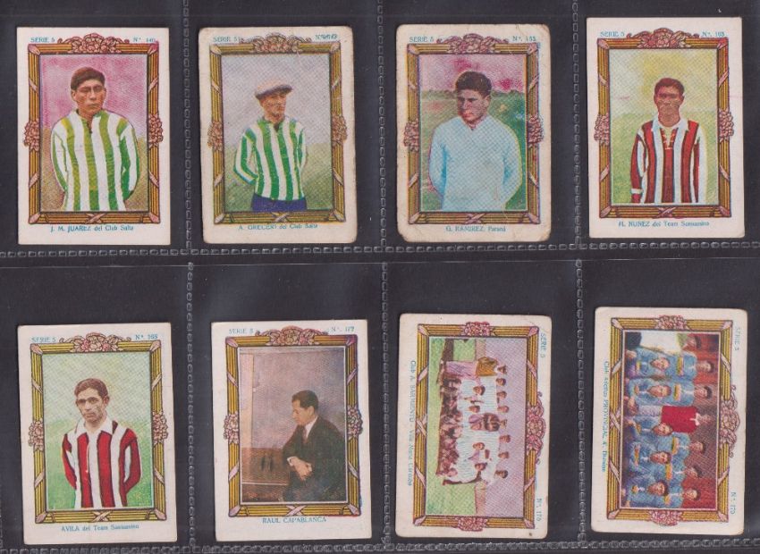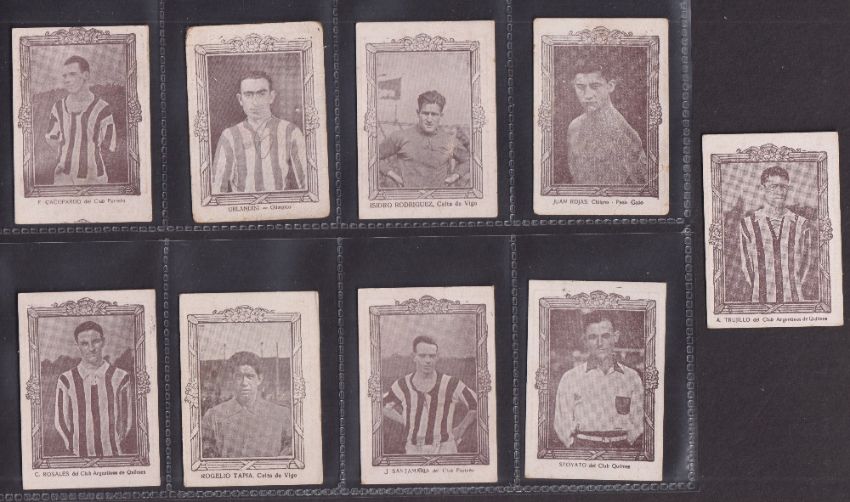 Cigarette cards, South America, Onagoity, Footballers (Back in brown with red overprint, wooden frame surrounds), 'M' size, 25 different cards, also 'Serie 4' Soccer, 2 cards & 'Serie 5', 22 different cards (some with faults, marks etc, fair/gd) (47)