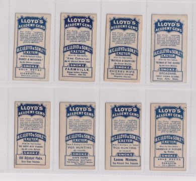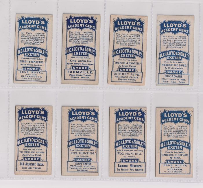 Cigarette cards, H.C. Lloyd & Son Ltd, Academy Gems (Green Fronts, multi-backed), 8 cards all with different brand backs (gd) (8)