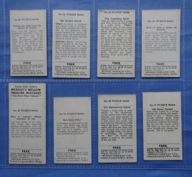 Cigarette cards, Murray, Puzzle series, 8 cards numbers 15 16 17 30 36 47 49, plus number 48 WITH original token (gen. about gd)