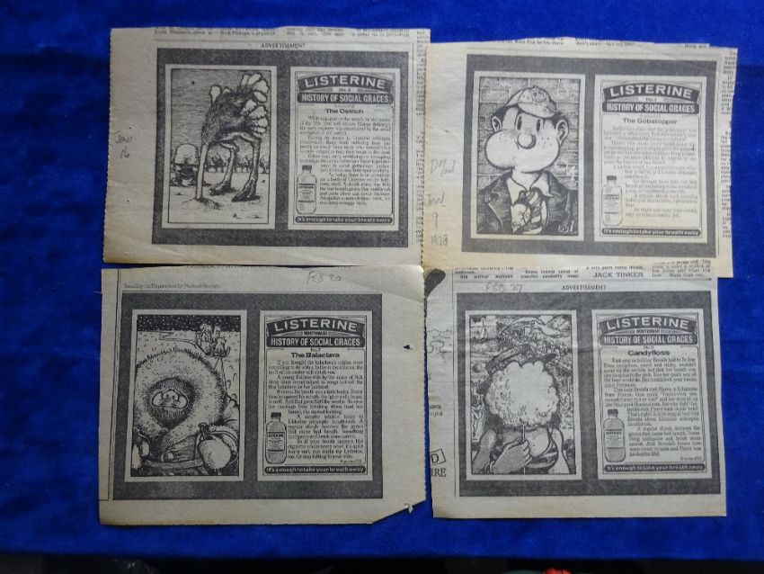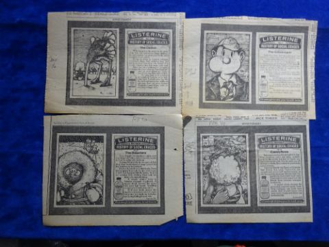 Newspaper trade cards, Listerine cards, approx. 24 some duplication, appearing as adverts in the papers in the form of a trade card front and back. ( cut form papers, gd)