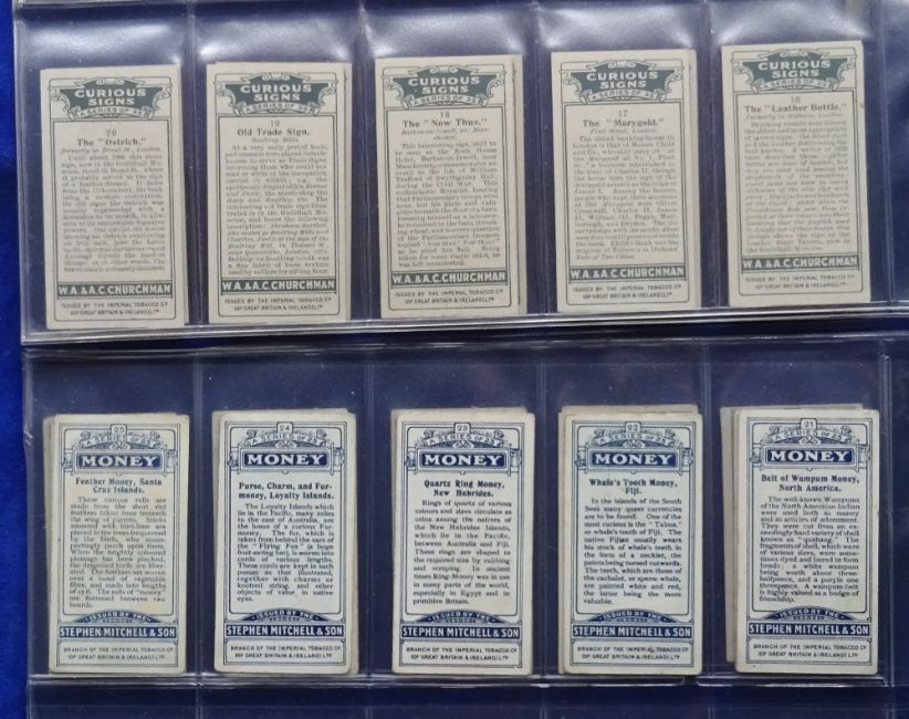 Cigarette cards, Various issuers, 6 sets, Wills Naval Dress & Badges, Wills Australia Time & Money (Vice Regal & Capstan printings), Ardath Stamps Rare & Interesting, John Player's Arms & Armour, Churchman Curious Signs, Mitchell Money (a few fair, gen gd/vg)