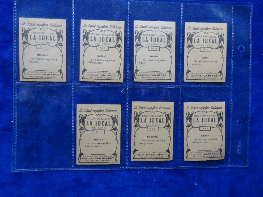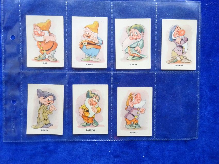 Cigarette cards, La Ideal Cigarillos, Serie 22 Walt Disney Characters, 7 cards numbers 1-7 each card featuring one of the Seven Dwarves from Snow White (gd/vg)