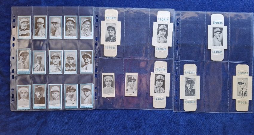 Cigarette cards, Godfrey Phillips Sports package issues (blue borders) many various series approx. 85 , mixture of paper & card issues some cut to size some with surrounds. Many Jockeys, some Radio and a few Boxing / Football etc (mixed condition throughout, poor/gd)