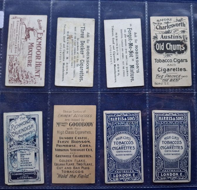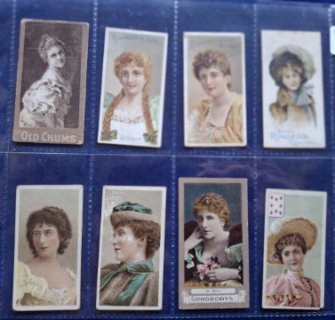 Cigarette cards, Beauties & Actresses, 8 type cards Charlesworth & Austin, Robinson's (2), ERB, Harris & Sons (2), Goodbody, Richmond Cavendish (small piece of corner missing on Richmond Covendis card, rest gen fair)