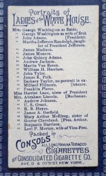 Cigarette cards, USA, Consolidated Tobacco Co Portraits of Ladies of the White House type card Mrs James A Garfield (just about gd)