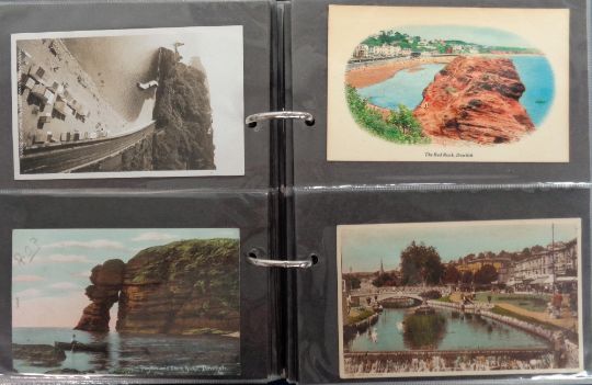 Postcards, Devon, a mixed age collection in modern album of approx. 147 cards of Dawlish, and surrounding area. RPs include Mount Pleasant Inn, Dawlish Warren Halt Station interior (3 different), aerial view of Dawlish (2), Torbay Express, view from Royal Hotel, Coast Guard Station, Lea Mount Tunnel, Holcombe Hall, Smugglers Inn etc. Sold with a few Starcross (RPs) and printed cards of Exmouth (mainly gd)