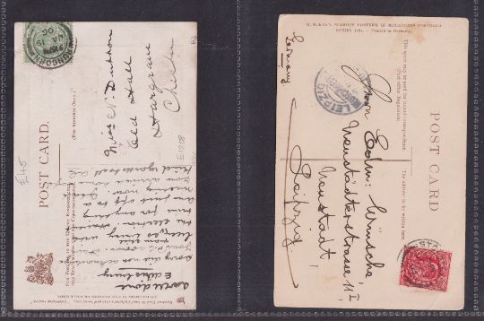 Cigarette advertising postcards, 2 postcards, both advertising Ogden's Guinea Gold Cigarettes, Raphael Tuck Celebrated Posters Series 1501, postally used 1906, plus HM & Co Famous Posters postally used 1903 (both postally used otherwise gd)