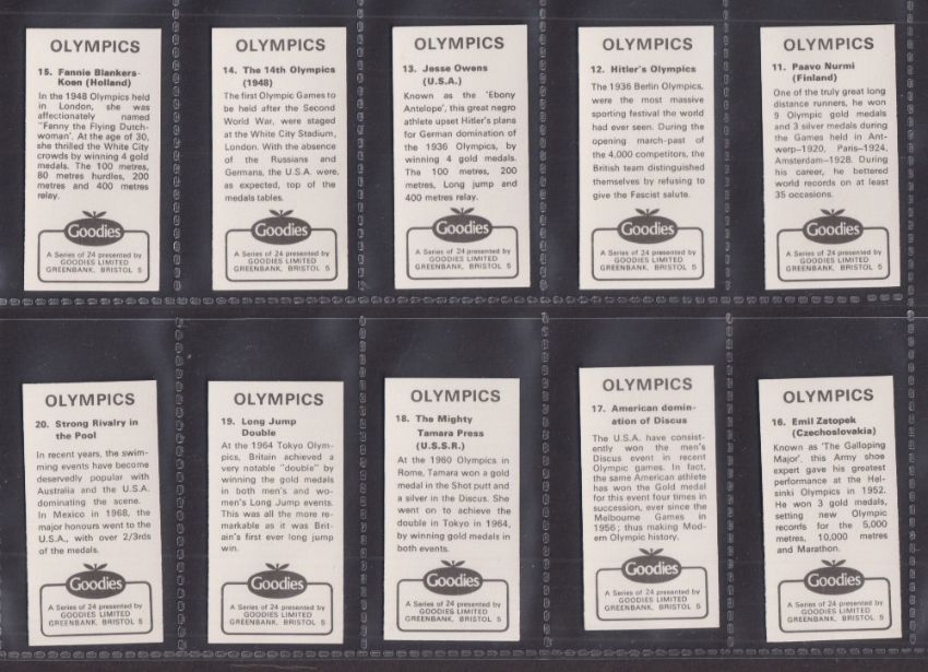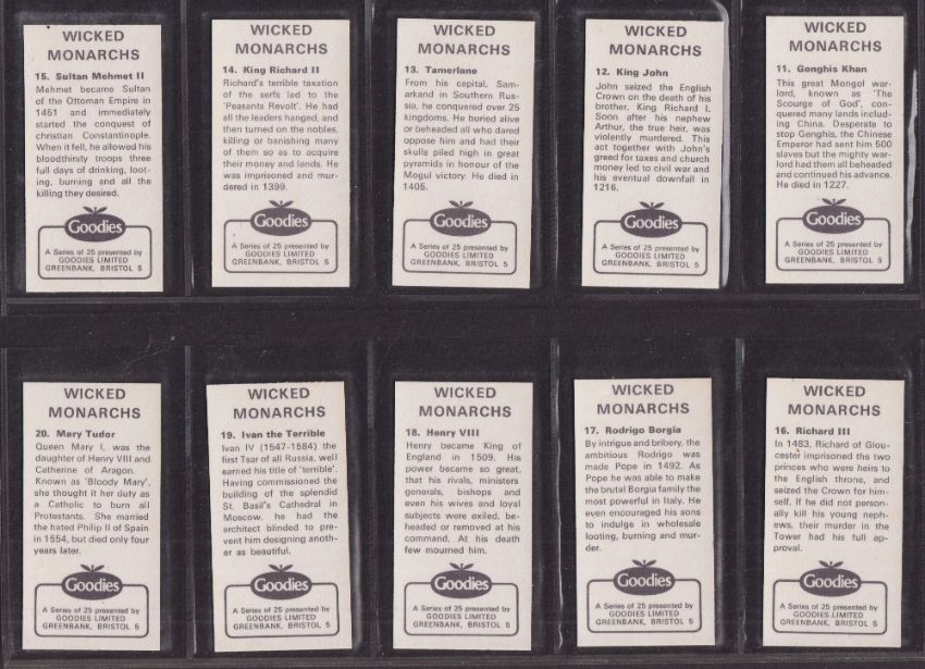 Trade cards, Goodies, 2 sets Olympics including Jesse Owens (set 24 cards) & Wicked Monarchs (set 25 cards) (gen vg a few gd)