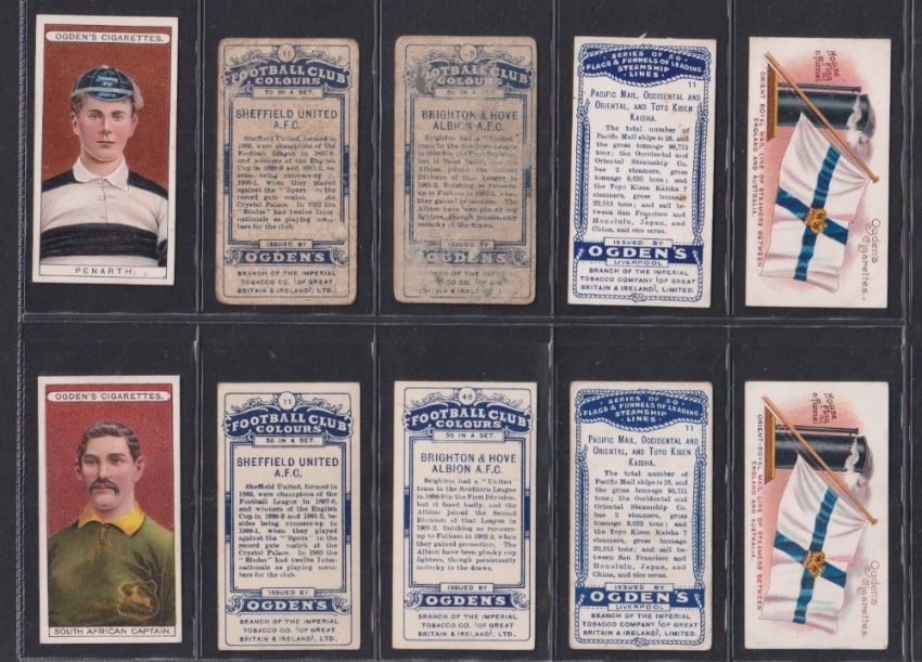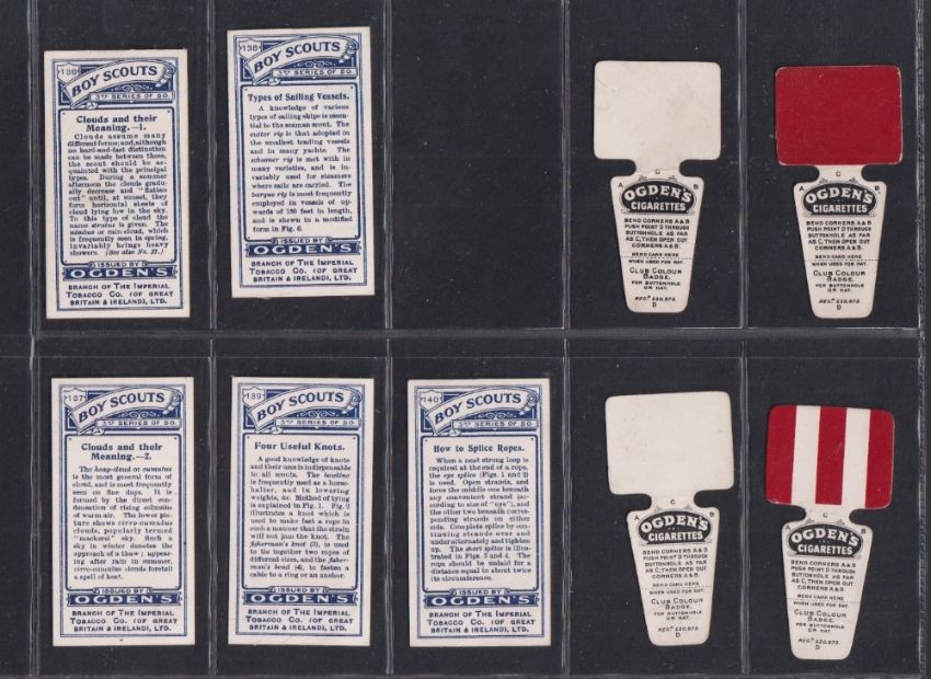 Cigarette cards, Ogden's, Error & Variety cards, a collection of 60+ error & variety cards, many in pairs for comparison inc., Football Club Badges (Shaped) (4), Boy Scouts (Various) (14), Football Club Colours (6), Pugilists in Action (6) etc (2 poor, rest gen. gd/vg)